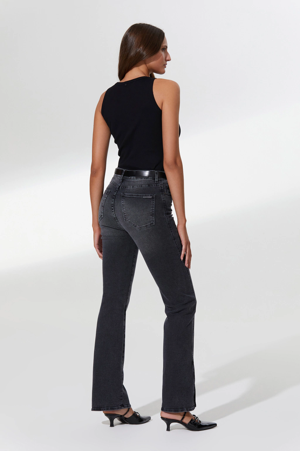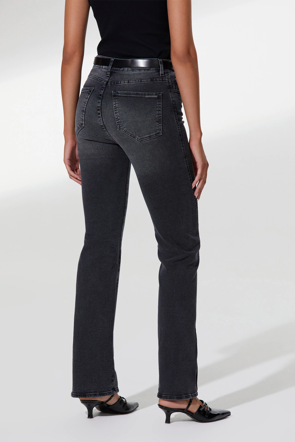 Pantalón de denim fit straight tiro alto, lavado negro con iluminaciones sutiles. Costura lateral trasladada sutilmente hacia el delantero y terminada con un tajo lo que le aporta un detalle moderno. Tejido con elastano que aporta confort. Metales exclusivos pulidos negro brillantes.