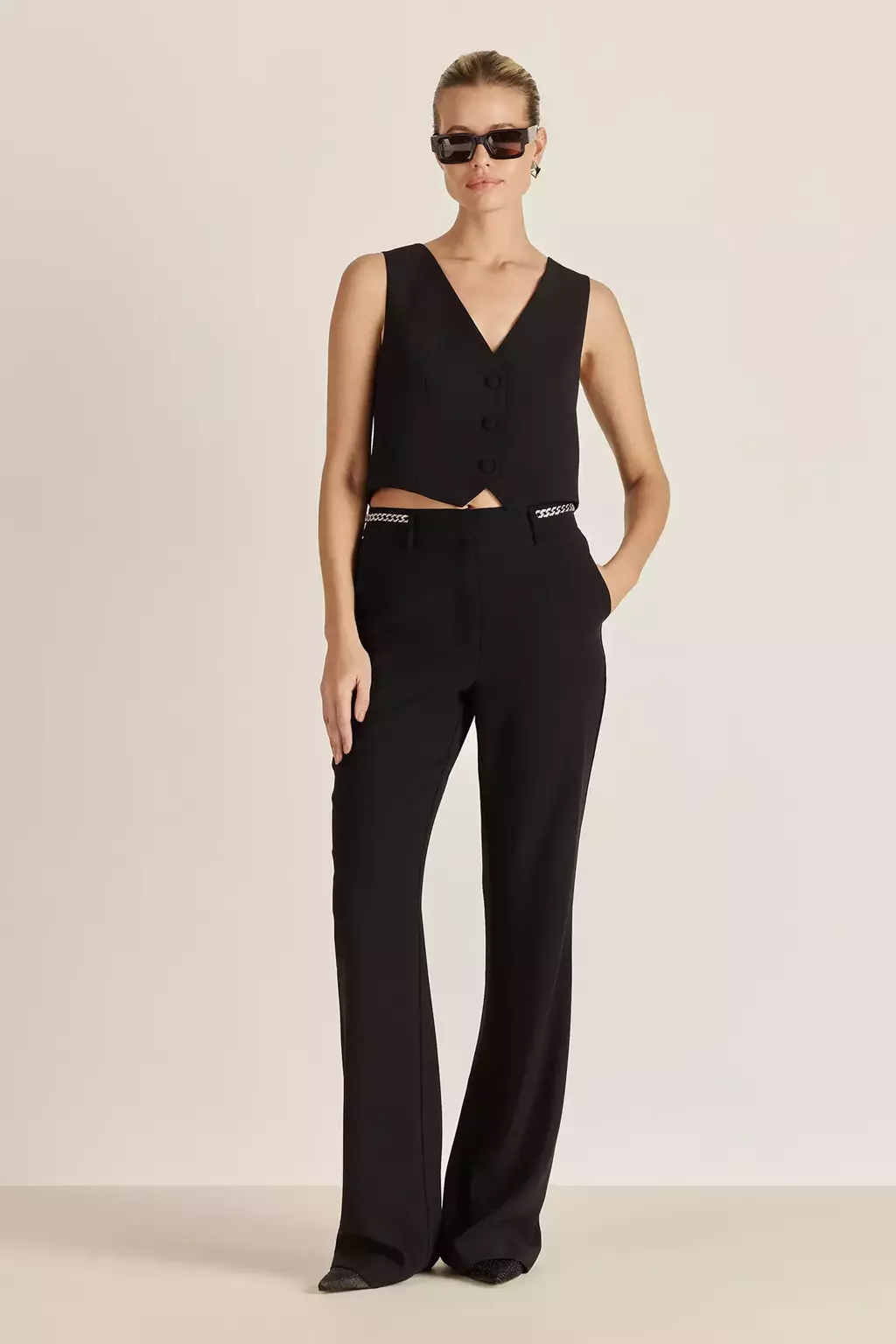 Pantalón de calce entallado confeccionado con género sastrero liviano, lleva una cadena con strass en la cintura. Un básico elevado, combinalo con el Chaleco Bloom para un total look #MuyTucci.