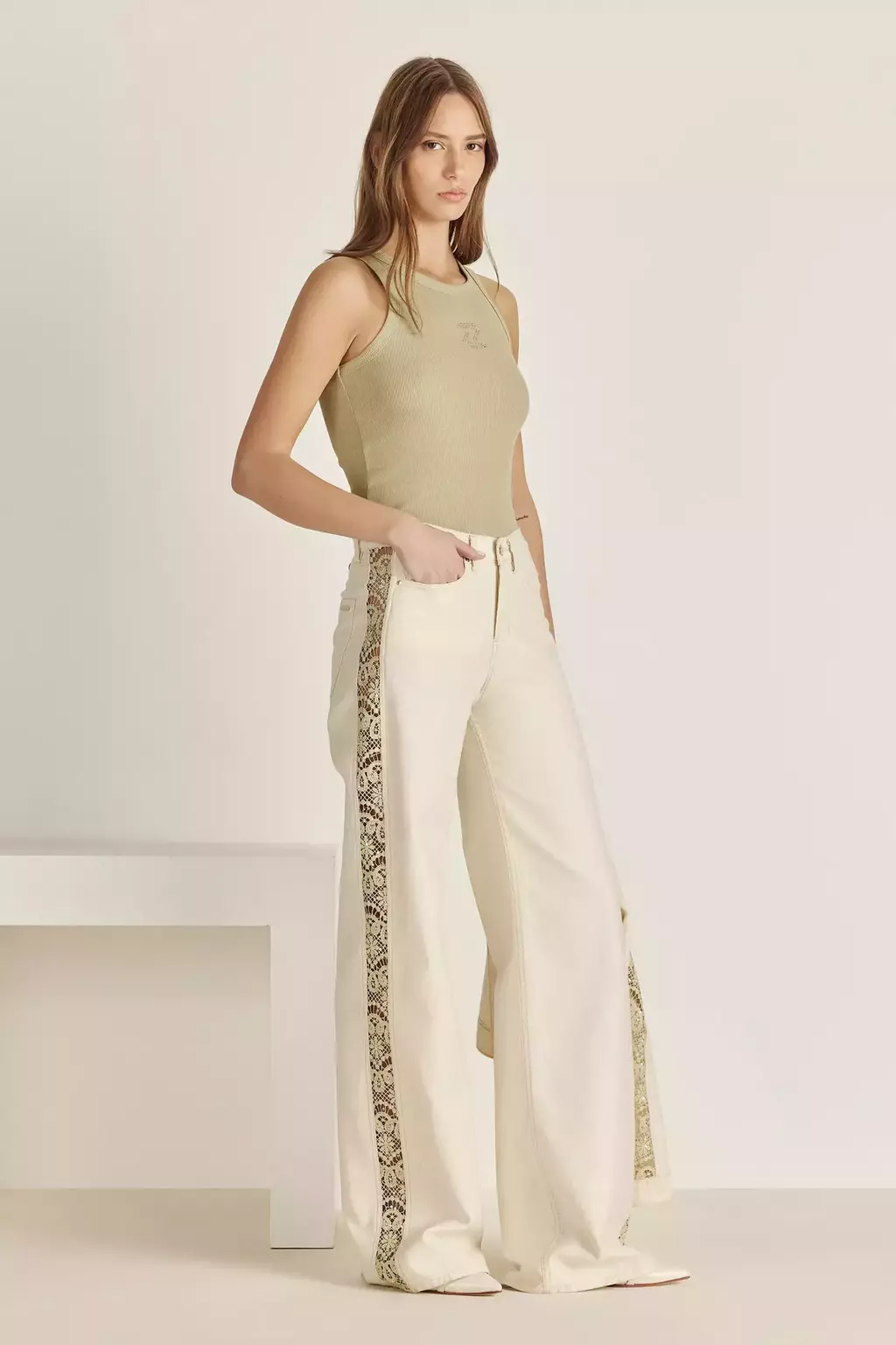 Pantalón de denim tiro bajo fit wide leg color crudo. Detalle de combinación de guipiure en laterales. Boton, remaches y chapita pulidos espejo exclusivos de la marca. Combinalo con la Campera Lace Ecru.