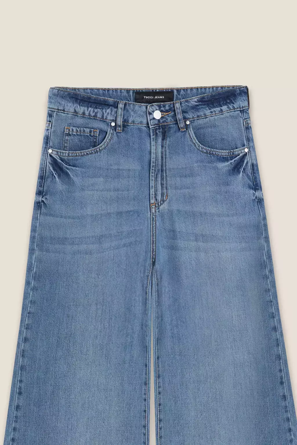 Pantalón de denim tiro medio fit wide leg. Tejido importado compuesto por hilatura de algodón fino premium. Lavado mid blue versatil para todos los días, iluminaciones y localizados delicados. Boton, remaches y chapita pulidos espejo exclusivos de la marca.