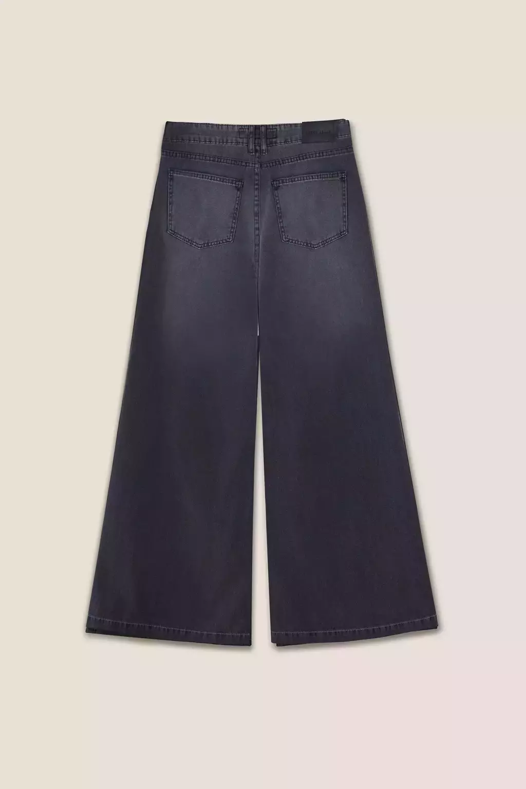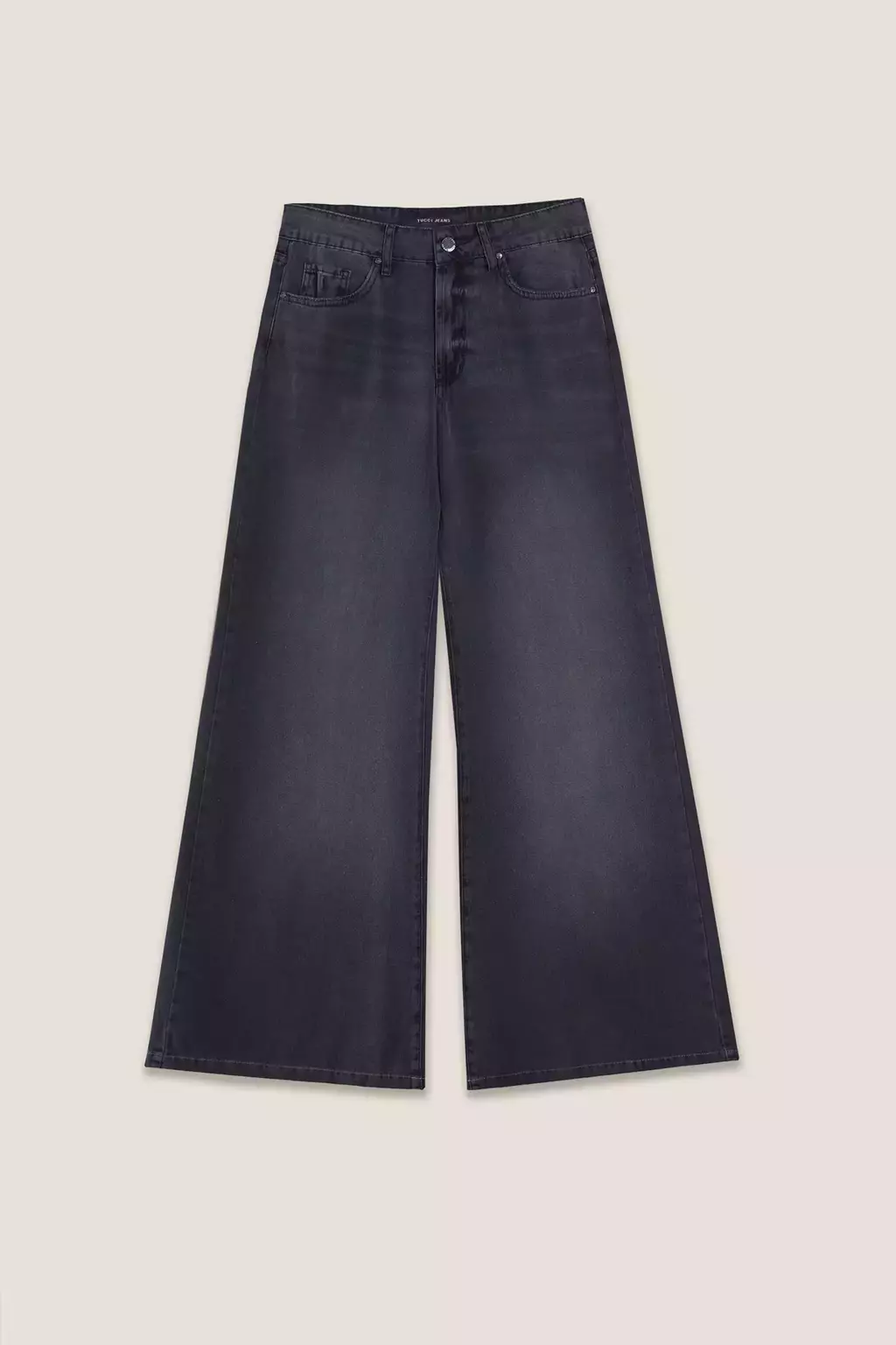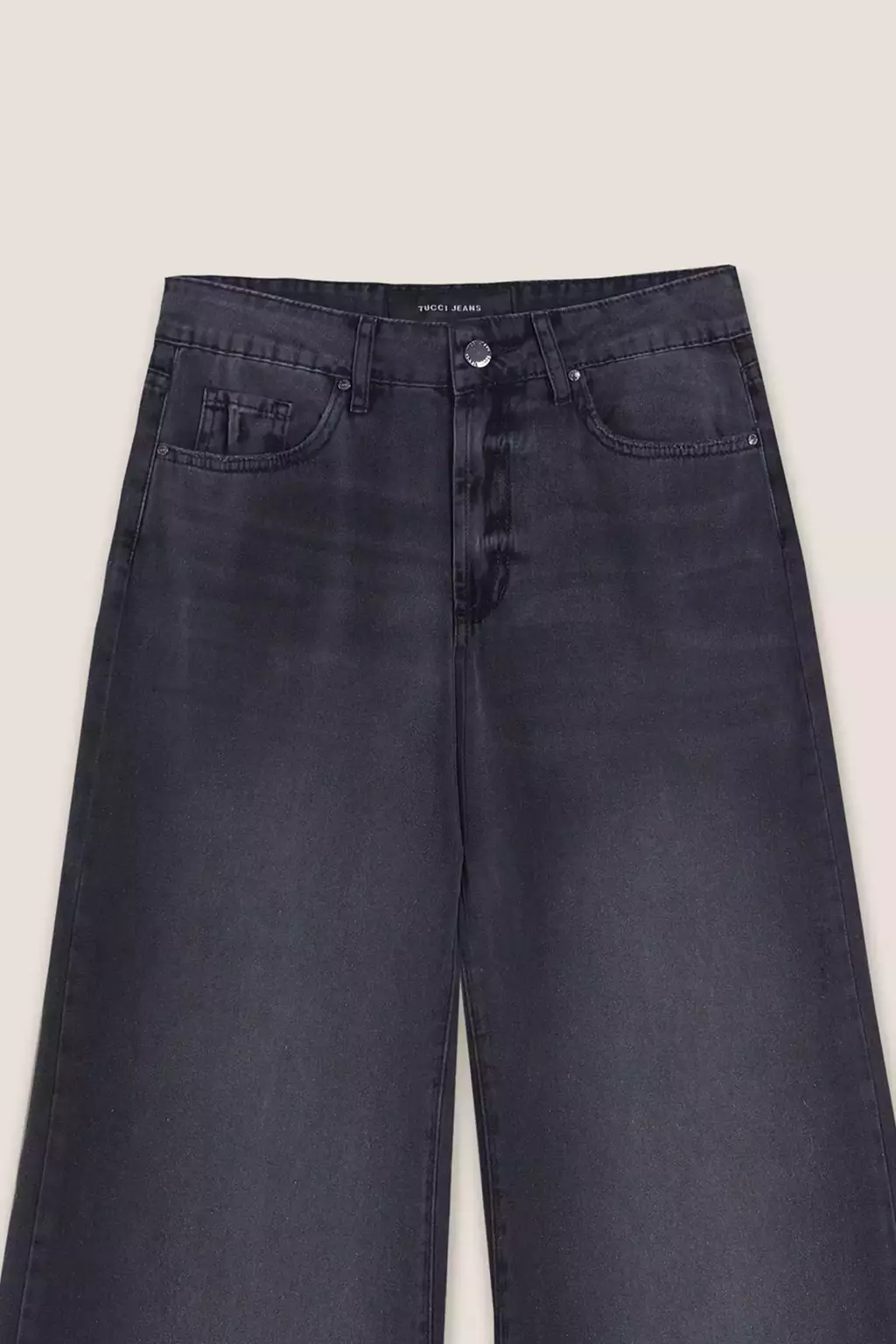 Pantalón de denim tiro medio fit wide leg. Tejido 100% algodón liviano, hilatura fina que le aporta frescura, comodidad y caida. Lavado negro envejecido que lo hace tu aliado versatil ideal tanto para el día. Boton, remaches y chapita pulidos espejo exclusivos de la marca.