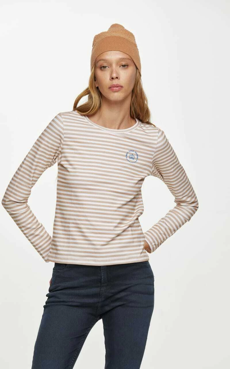 Remera rayada, manga larga, fit al cuerpo, largo por arriba de la cadera y con escote redondo. Lleva una estampa central en el delantero.