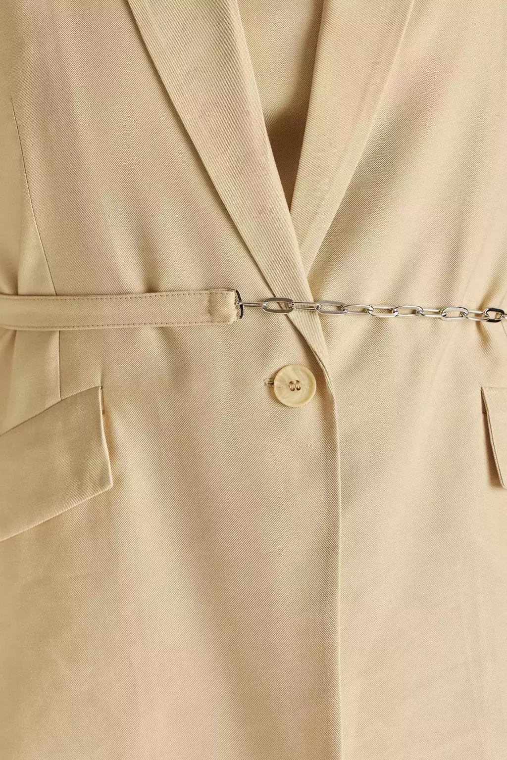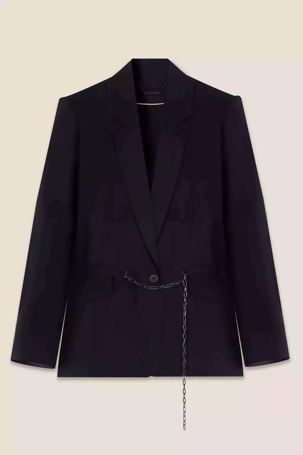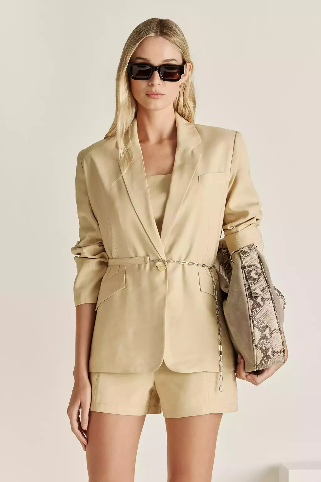 Saco confeccionado en sastrero liviano con textura. Lleva botones exclusivos de la marca a tono. En la cintura, lleva lazo con cadena exclusiva de la marca que permite ajustar la prenda a gusto, realzando la silueta con un toque moderno y distintivo. Un ítem infaltable en tu placard, perfecto para completar tu look con el Pantalón Sartoria y lograr un conjunto elegante o con el Short Sartoria para un look más audaz y fresco que deja lucir tus piernas. La nueva sastrería: femenina, versátil y 100% Tucci.