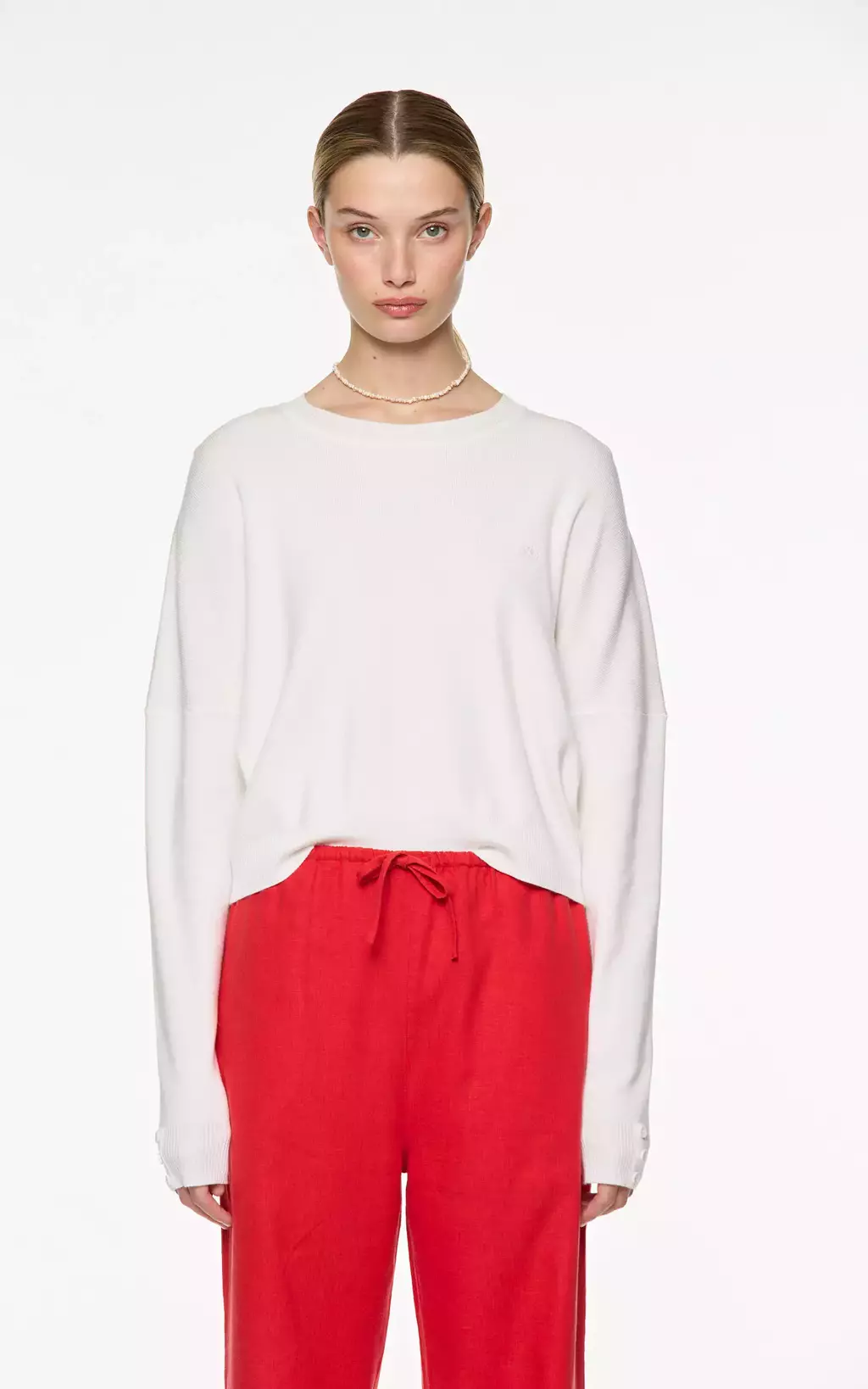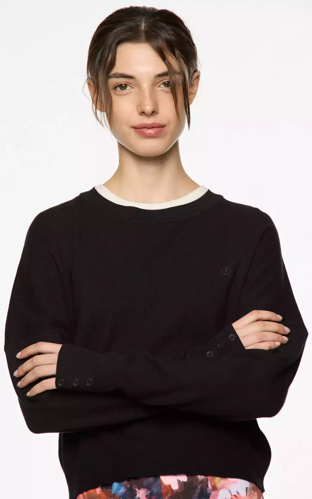Sweater silueta oversize tejido en punto tela manga larga, escote redondo a la base con ribb. Puños de manga y ruedo tambien llevan ribb. En puño de manga lleva botones marcarios. Posee logo bordado en delantero. Producto importado. Diseñada para acompañar looks frescos y auténticos, sin resignar comodidad ni estilo.