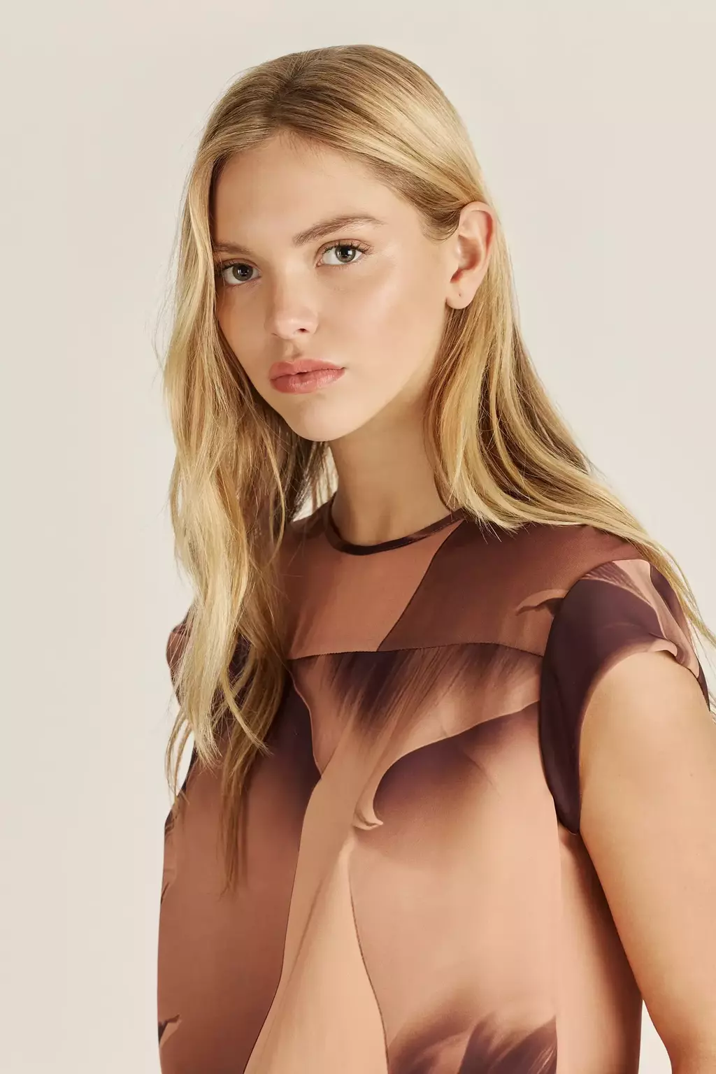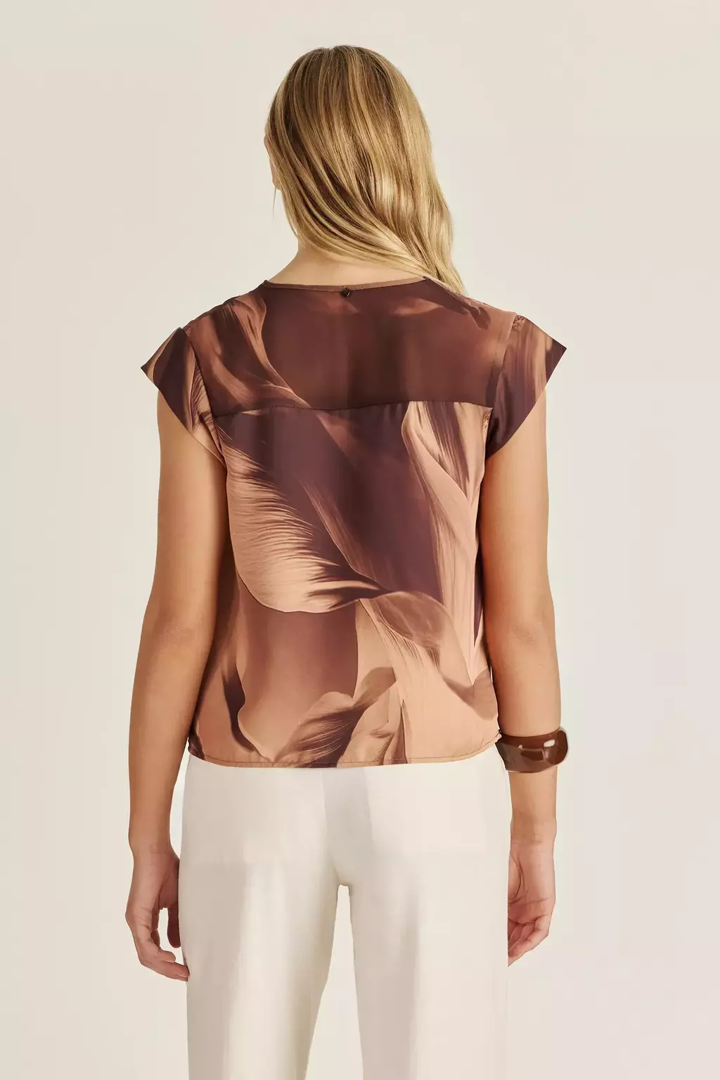 Top confeccionado en una combinación de género satinado y otro translúcido, ambos con una estampa exclusiva de la colección Verano 26, que aporta frescura y movimiento a esta temporada.